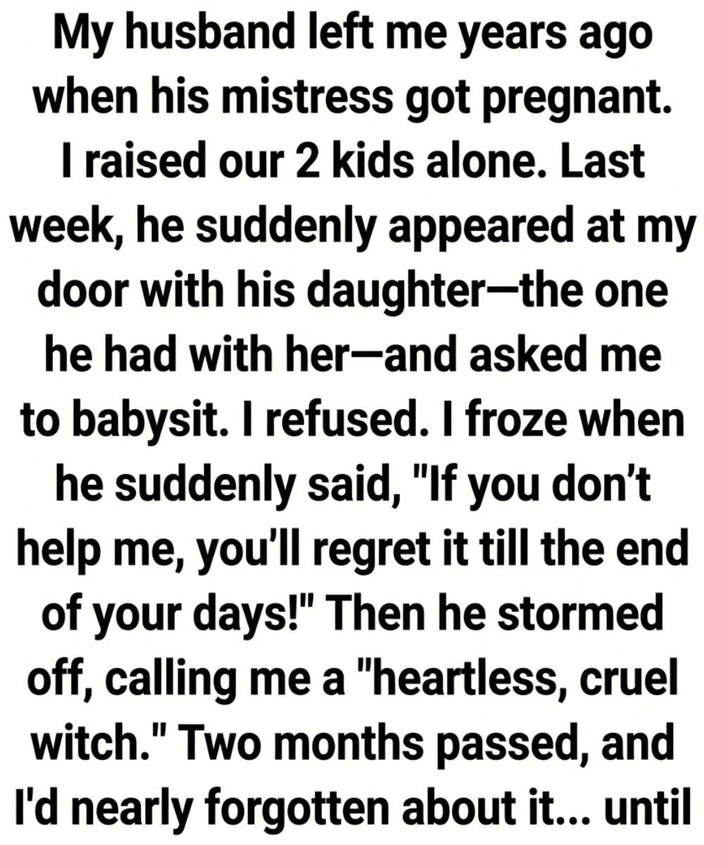 Time passed, and I learned to stand on my own without bitterness guiding my choices. I didn’t wait for apologies or closure; I simply moved forward. Then, one afternoon, the past returned unannounced. My former husband appeared at the door, a young girl by his side—his daughter from the life he built after leaving us. Casually, he asked if I could look after her for a while. I felt disbelief more than anger; after years of carrying responsibility alone, he now expected something from me without acknowledgment of what he had done. I said no, calmly, explaining that I couldn’t take on that role.