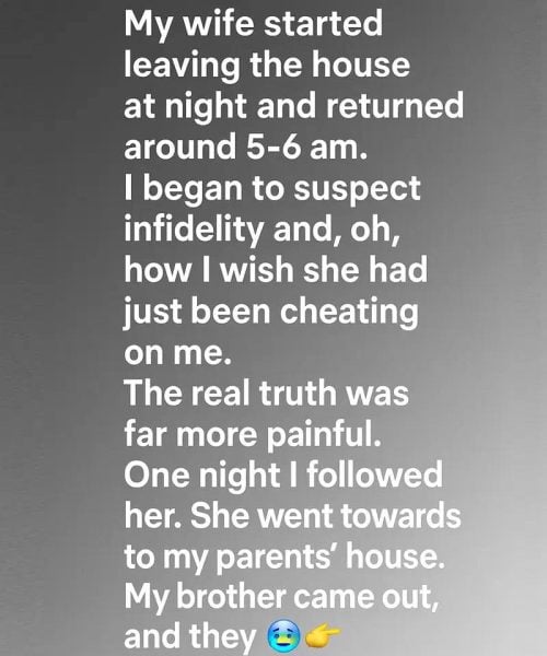 At first, I tried to ignore the uneasy feeling. My wife had begun leaving the house late at night and returning around five or six in the morning. I told myself she was just out driving or visiting friends, but as the nights became more frequent, suspicion slowly took hold. Fear crept into my thoughts, and I began to dread the possibility of infidelity. One night, unable to bear the uncertainty any longer, I decided to follow her, my heart pounding as I kept a careful distance behind her car.
