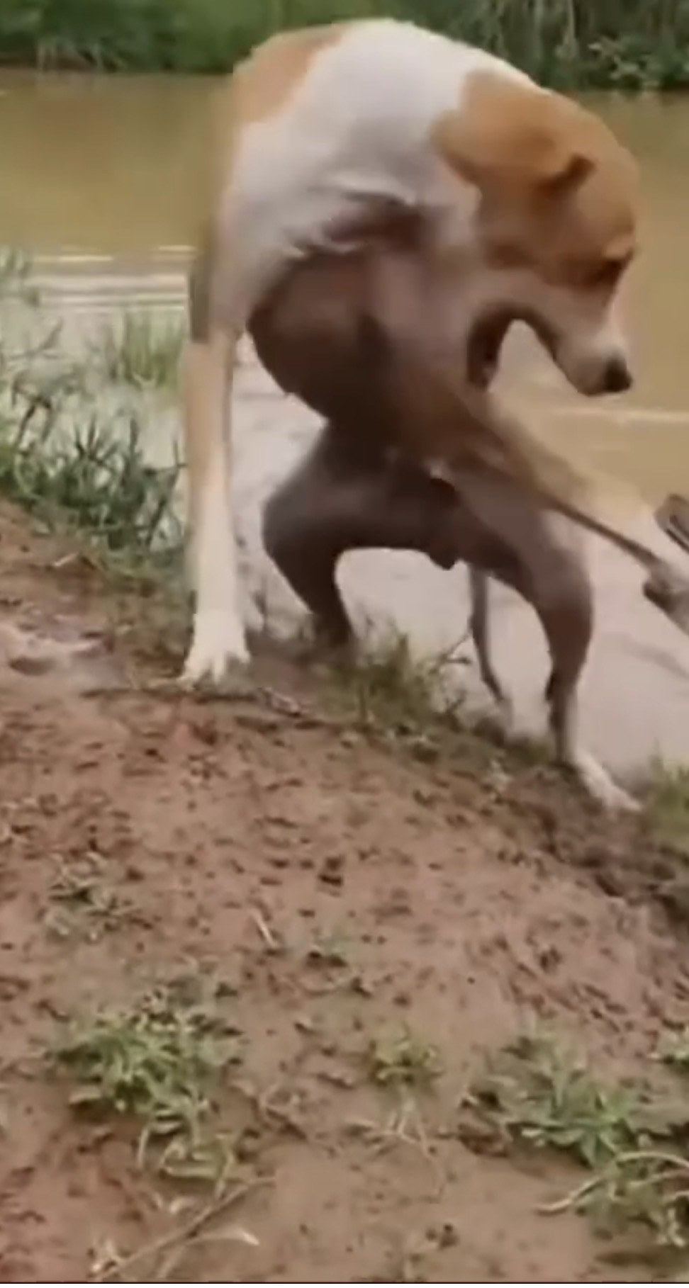 A frightening incident was captured near a riverbank, where a dog was attacked by a large snake. According to footage circulating on social media, the snake bit the dog on its leg while it was standing near the water.