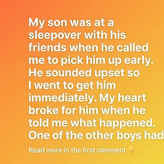 My son was at a sleepover with his friends when he called me to pick him up early. He sounded upset so I went to get him immediately. My heart broke for him when he told me what happened.