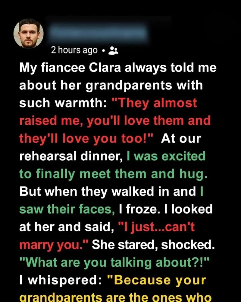I thought I knew everything about Clara until her grandparents showed up at our rehearsal dinner—and everything changed. We met two years ago in a bookstore, and our love grew quietly and deeply. She was my calm, my home.
