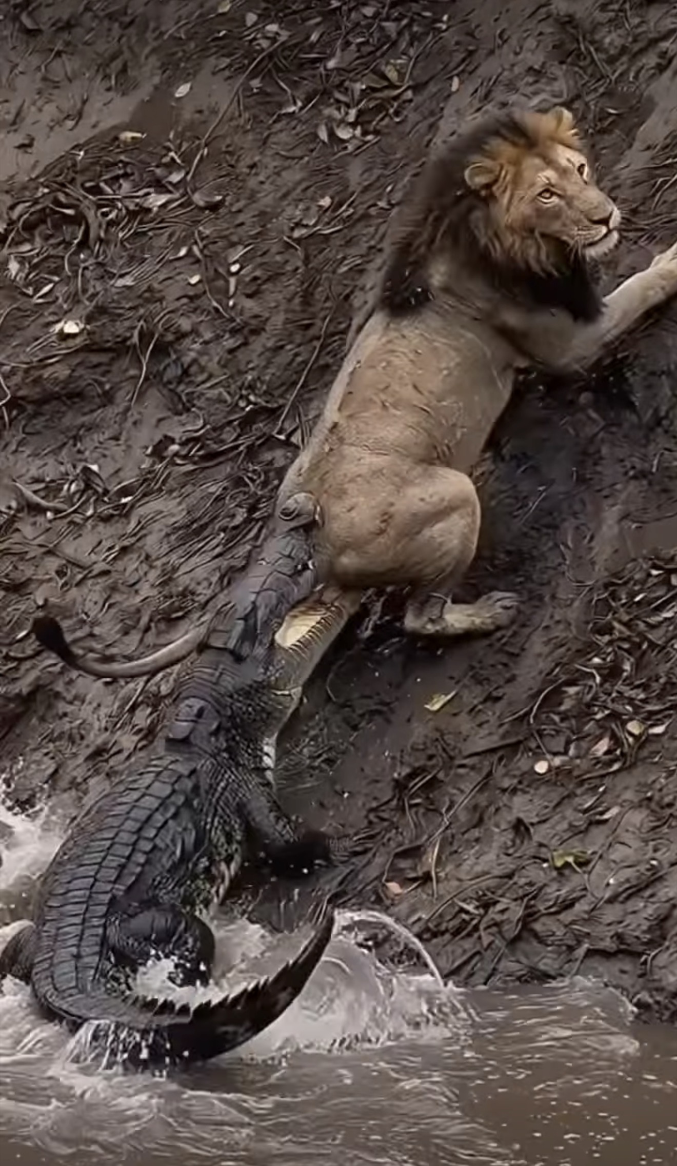 A powerful crocodile surges from the churning water, its jaws locked in an unyielding grip. The lion, once the symbol of dominance and strength, is caught in a moment of vulnerability where land and water collide.WATCH MORE BELOW…