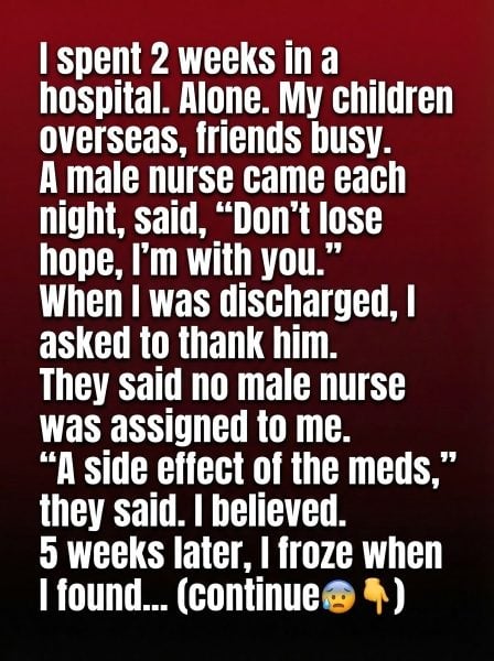 The day I was discharged, gratitude pushed me to the front desk, and I asked how I could thank him. The staff looked puzzled, flipping through schedules with polite confusion, then told me there had been no male nurse assigned to my room during my stay. They offered explanations in careful voices, stress, exhaustion, medication, the mind filling in gaps when the body is worn down. I nodded and accepted what they said because arguing would have made me sound unwell, and because part of me was too tired to chase something I couldn’t prove. Still, the answer left a quiet unsettled feeling in my chest, like a door had been closed on a memory I was certain I had lived. I focused on recovery the way you’re supposed to, telling myself healing sometimes comes with moments you don’t fully understand.