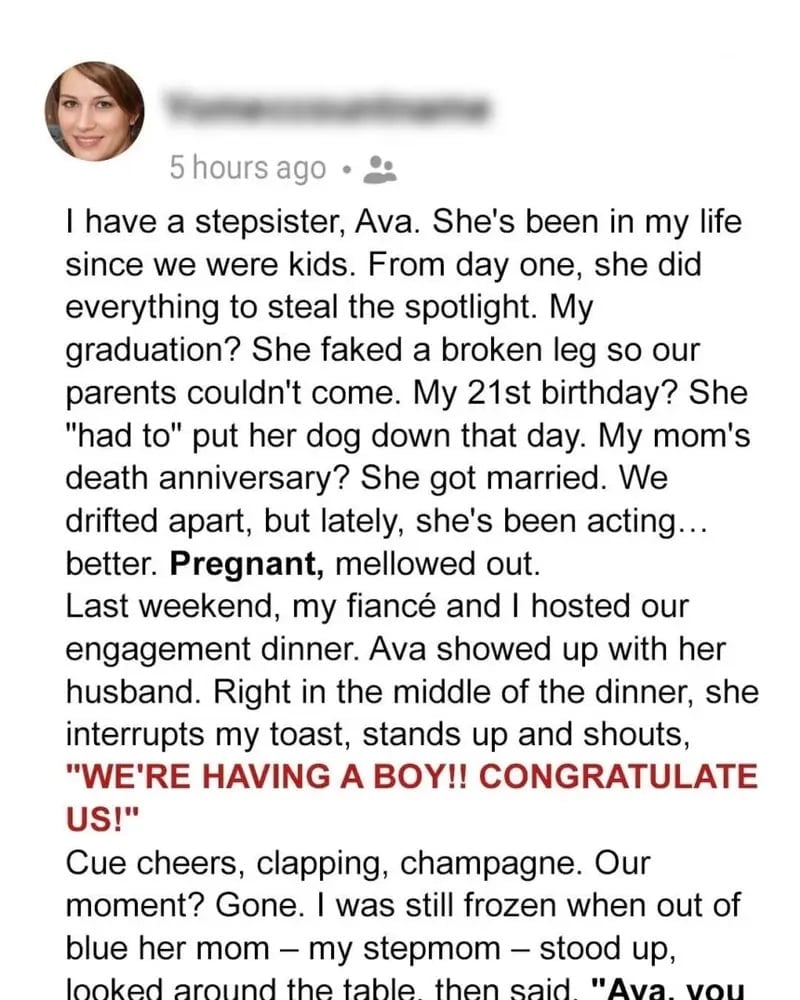 Just as I raised my glass, Ava stood and loudly announced she was having a boy. In seconds, my engagement dinner transformed into her impromptu gender reveal. Once again, my carefully planned moment faded into the background.