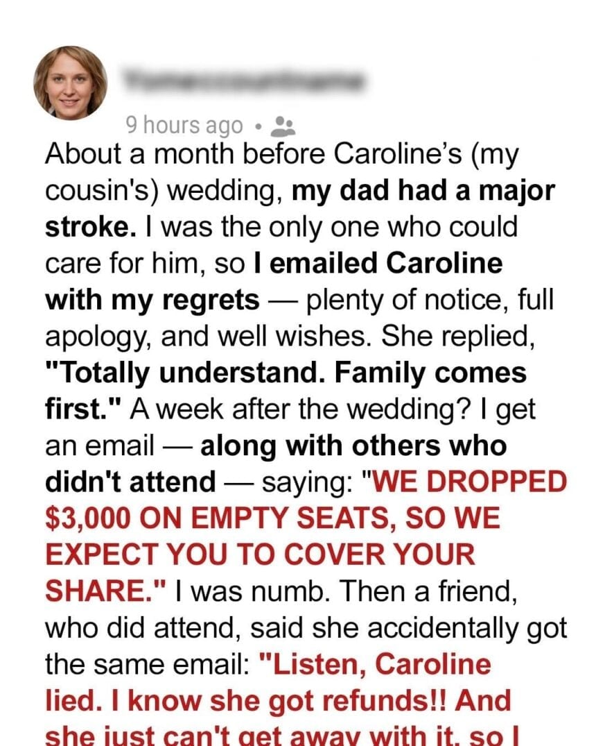 I always grew wary of people who say “family first” but act differently. My cousin Caroline claimed she understood when I missed her wedding because my father suffered a massive stroke and needed full-time care. I believed her—until a week later, when she sent a mass email demanding $3,000 to cover my “empty seat.”