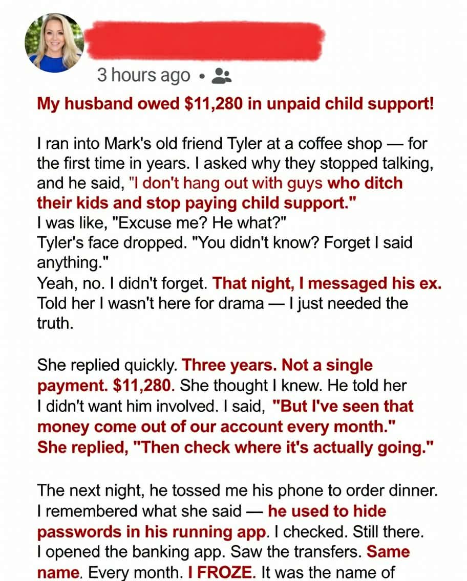 Then a run-in with his former best friend revealed a truth I couldn’t ignore. I reached out to Sarah, bracing for hostility, but found a tired, kind woman with proof—over $11,000 in unpaid child support. The shock deepened when I realized Mark had been withdrawing that exact amount from our joint account each month.