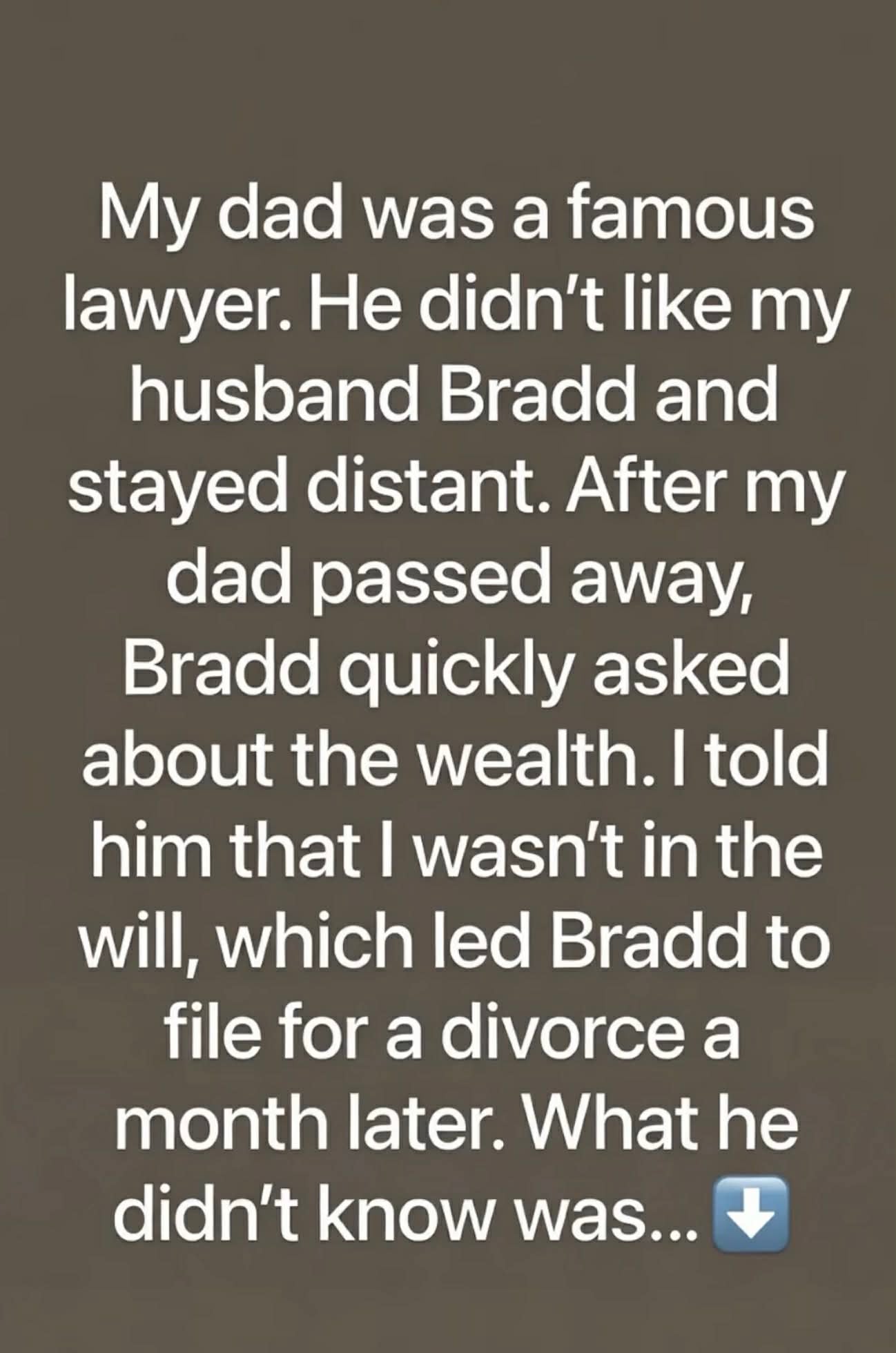 But there was more. A week later, Sarah’s father’s lawyer called her in. Her father had left a private addendum to his will: If Bradd remained married to Sarah for five years after his death, he would receive half the inheritance.