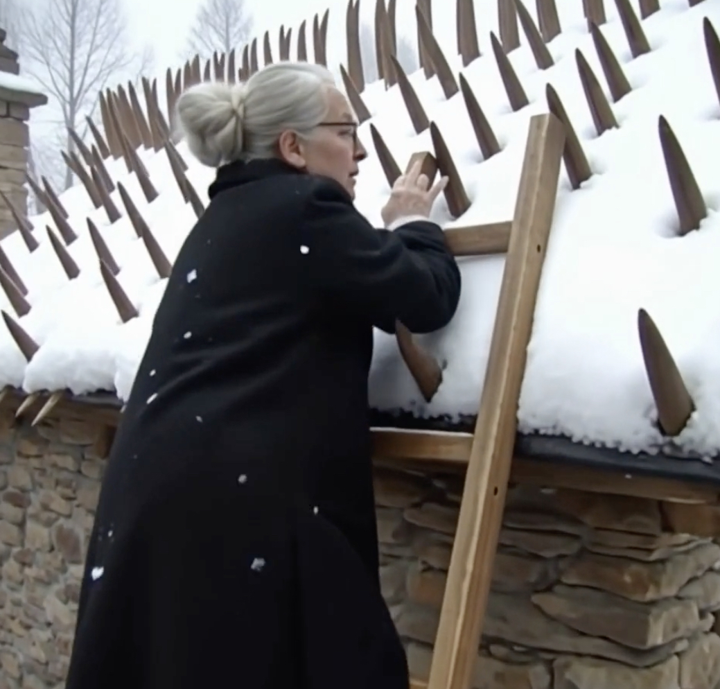 But one house stood defiant against the storm—the old woman’s. Her roof, covered with sharp wooden stakes, provided the perfect defense against the snow. The stakes broke up the snow and wind, preventing the buildup that would have otherwise crushed her home. The pointed spikes directed the snow and ice off the roof, keeping it clear and intact.