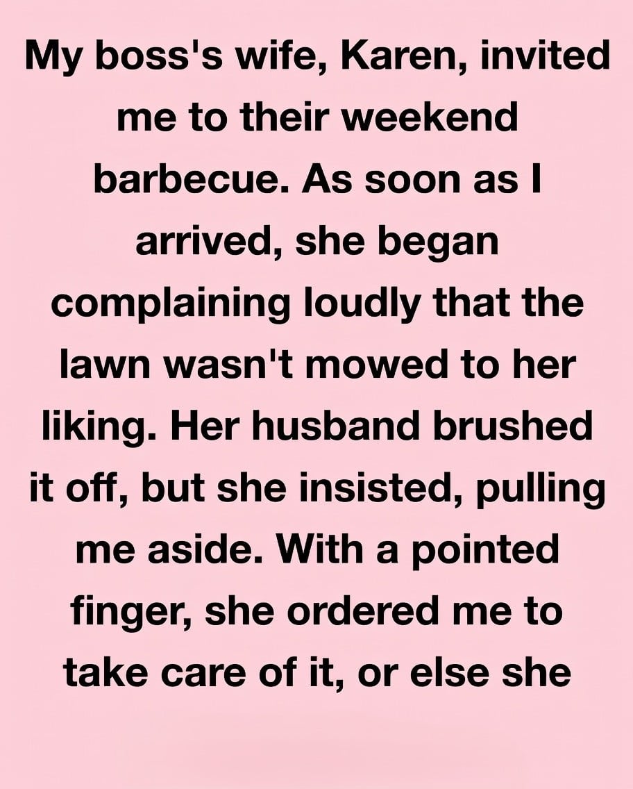 My boss’s wife, Karen, invited me to their weekend barbecue, but the moment I arrived she began complaining loudly that the lawn wasn’t mowed the way she wanted. While her husband brushed it off, she pulled me aside and demanded that I take care of it. She even threatened to tell everyone about a minor incident from the previous year when I accidentally spilled coffee on her rug. Surprised and uncomfortable, I calmly reminded her that I was a guest and mowing the lawn wasn’t exactly part of the invitation.