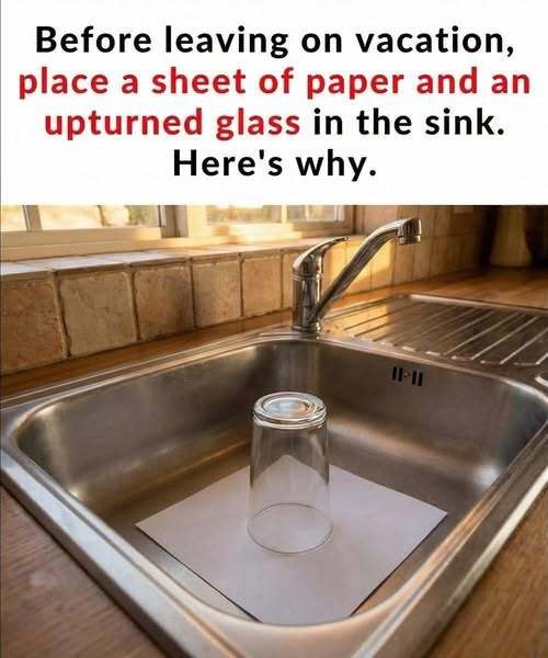 Before heading out on vacation, most people take care of the obvious tasks: cleaning out the fridge, setting lights on timers, arming the alarm system, and watering the plants. But there’s one small household detail that often goes unnoticed — the sink drain. While it may seem harmless, leaving it unprotected for days or weeks can sometimes lead to unpleasant odors or minor pest issues. Fortunately, there’s a simple and cost-free precaution that many home maintenance professionals recommend: placing a paper towel over the drain and covering it with an upside-down glass before you leave.