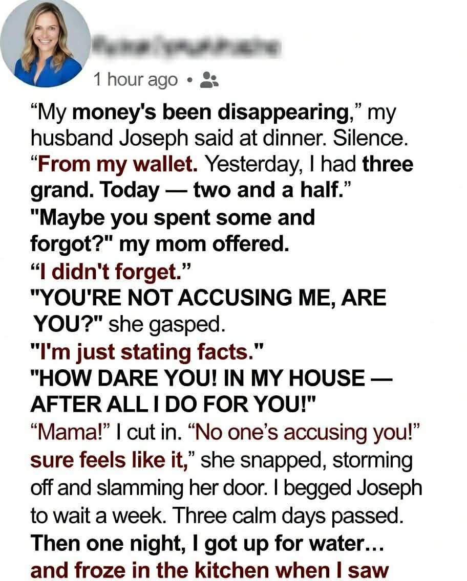 Moving in with my mom was supposed to be a temporary way for my husband, Joseph, and me to save for our own place. At first, everything seemed perfect — she cooked, did laundry, and offered us a cozy guest room.But as time passed, tension grew. One night, Joseph mentioned that money had been disappearing from his wallet. Mom denied it, seeming deeply offended, and the atmosphere at home became cold and distant.