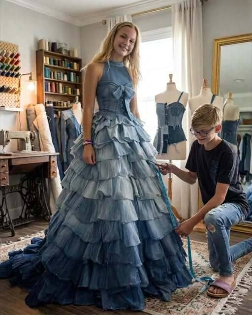 A few days later, Noah walked into my room holding a stack of our late mom’s old denim jeans. He reminded me that he had taken a sewing class at school and asked if I trusted him enough to try something creative. Together, we spent quiet evenings working on a dress while Carla was busy elsewhere. Using our mom’s sewing machine, Noah carefully cut and stitched the denim pieces into a flowing design with different shades of blue and thoughtful details. The finished dress was unlike anything I had seen before—stylish, meaningful, and full of heart. When Carla discovered it hanging in my doorway, she laughed and predicted that everyone at school would make fun of it. Despite her reaction, I decided to wear it anyway, proud of what my brother had created.