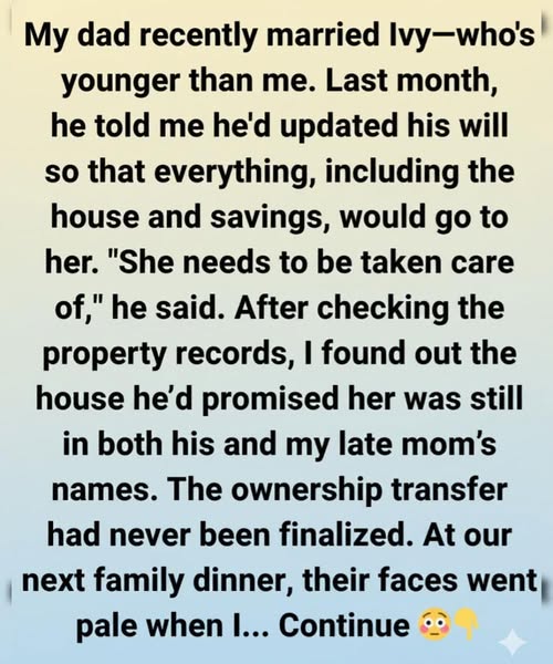 At the next family dinner, I calmly explained the situation: the house wasn’t entirely his to leave behind. The moment the words left my mouth, the room went silent. Ivy’s confident expression vanished, and my father looked stunned and angry. He accused me of going behind his back, while I reminded him I was simply protecting my mother’s legacy. Since then, things between us have been tense. He calls me selfish and claims I’ve threatened Ivy’s security, but I can’t help wondering: was it wrong to stand up for what legally belonged to me—or was I simply the only one unwilling to pretend it didn’t?