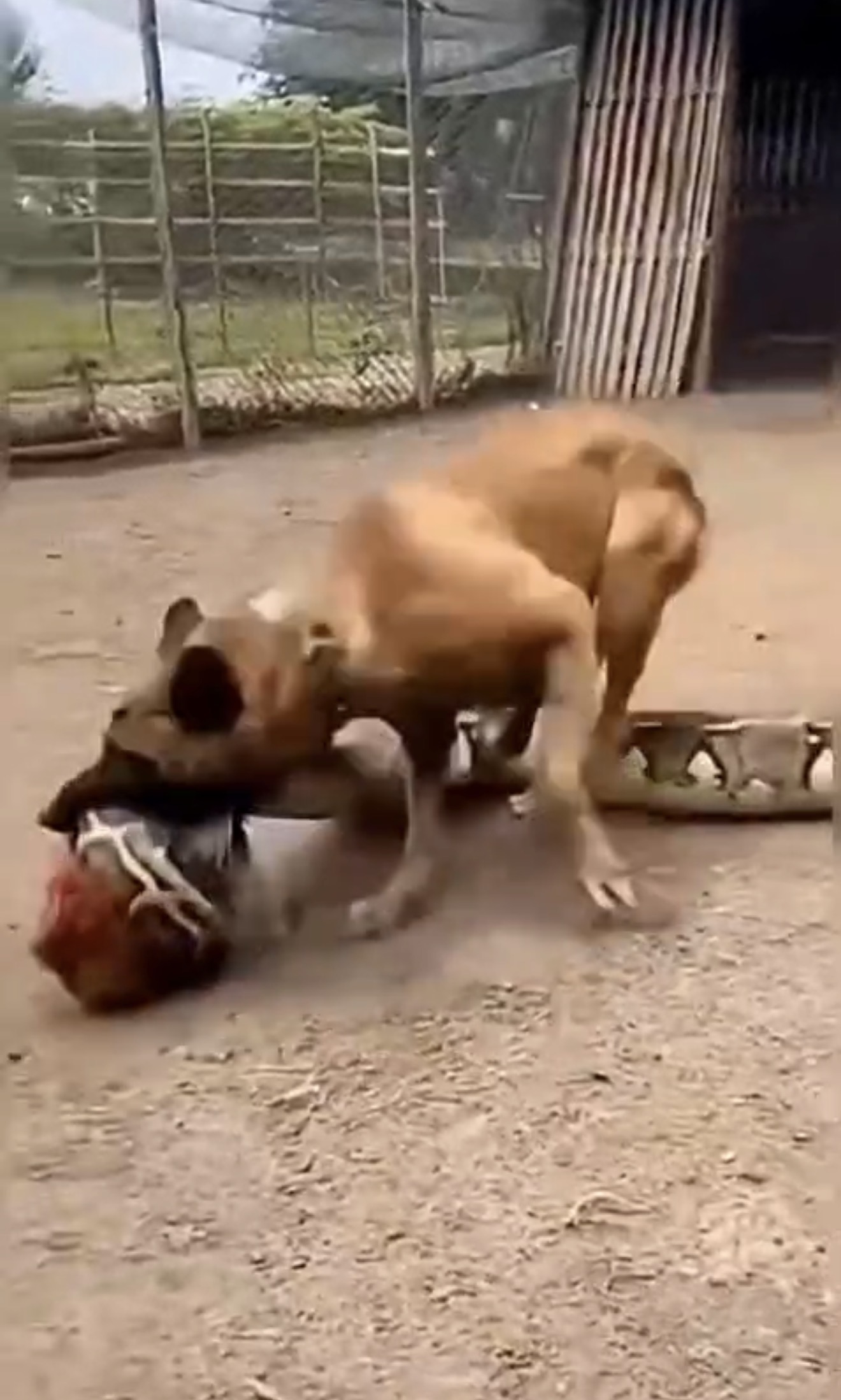 The event reportedly took place in a rural area surrounded by fencing and farm structures. In the video, the rooster is seen struggling on the ground as the dog continues the aggressive attack.