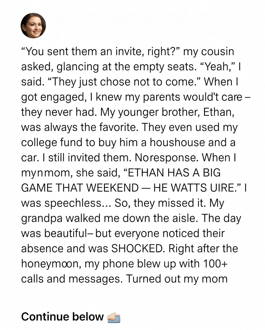 On my wedding day, two seats at the front remained empty — my parents’ seats. For years, they’d favored my brother Ethan, the star athlete, while I quietly accepted being second best. I hoped my wedding would finally bring us together, but a month before the big day, my mom casually told me they wouldn’t attend because Ethan had an important game.
