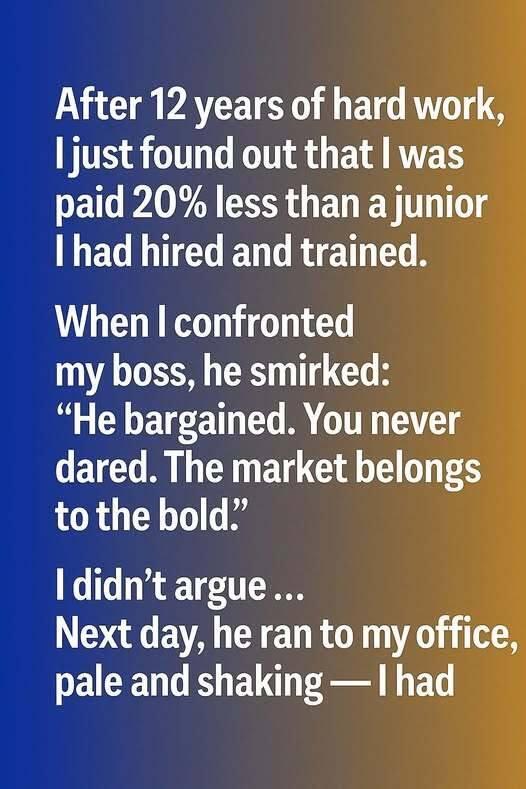 After 12 years of hard work as a senior projects manager, I just found out I’m paid 20% less than a junior I hired and trained. When I confronted my boss, he smirked: “She bargained. You never dared. The market belongs to the bold.” I didn’t argue.