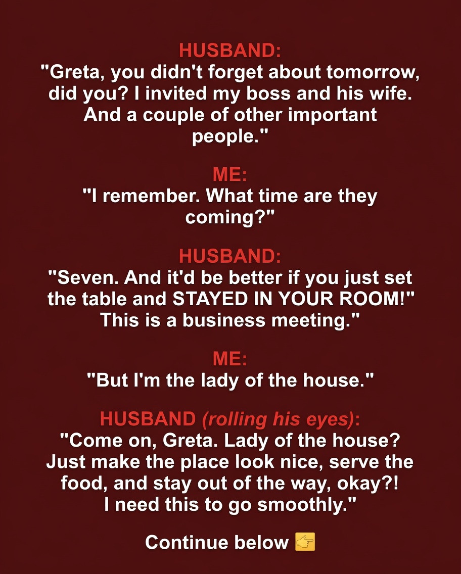 Greta had spent years supporting her husband Rett’s career, moving cities, giving up her graphic design studio, and hosting countless dinners to help him succeed. When Rett told her to serve food and hide in their room during an important work dinner, something inside her shifted. She realized she had been treated more like part of the furniture than a partner, and she quietly decided it was time to reclaim her voice.