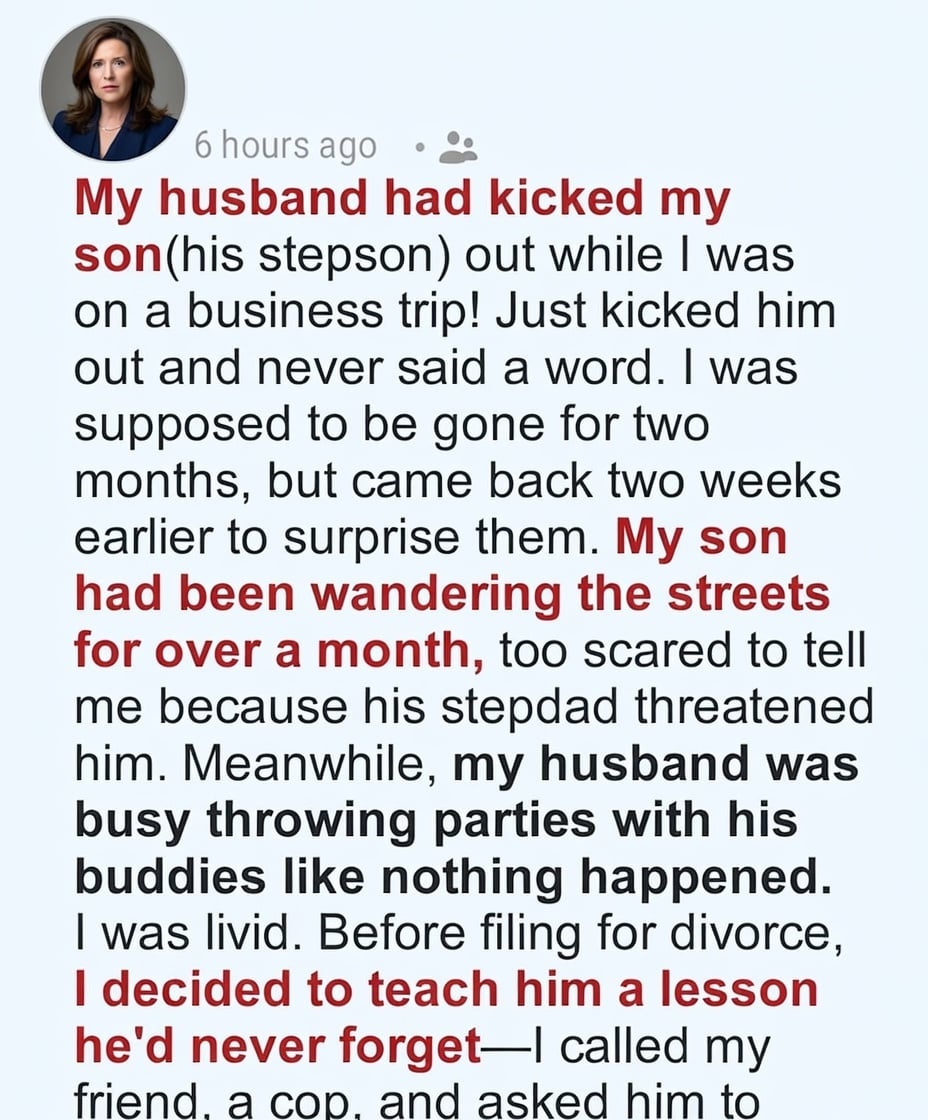 My stomach dropped. “What do you mean he moved out?” I demanded. Mark rolled his eyes and muttered something about Jake needing to learn responsibility and not following his rules. Within an hour I found my son two blocks away, sleeping on a bench at a bus stop with his backpack clutched tightly against his chest. When he saw me, his tired eyes widened. “Mom?” he whispered. My heart broke when he explained what had happened. The day after I left, Mark had thrown him out of the house and warned him not to tell me or things would get worse. For more than a month Jake had been drifting between friends’ couches and the streets while Mark carried on with parties like nothing had happened.