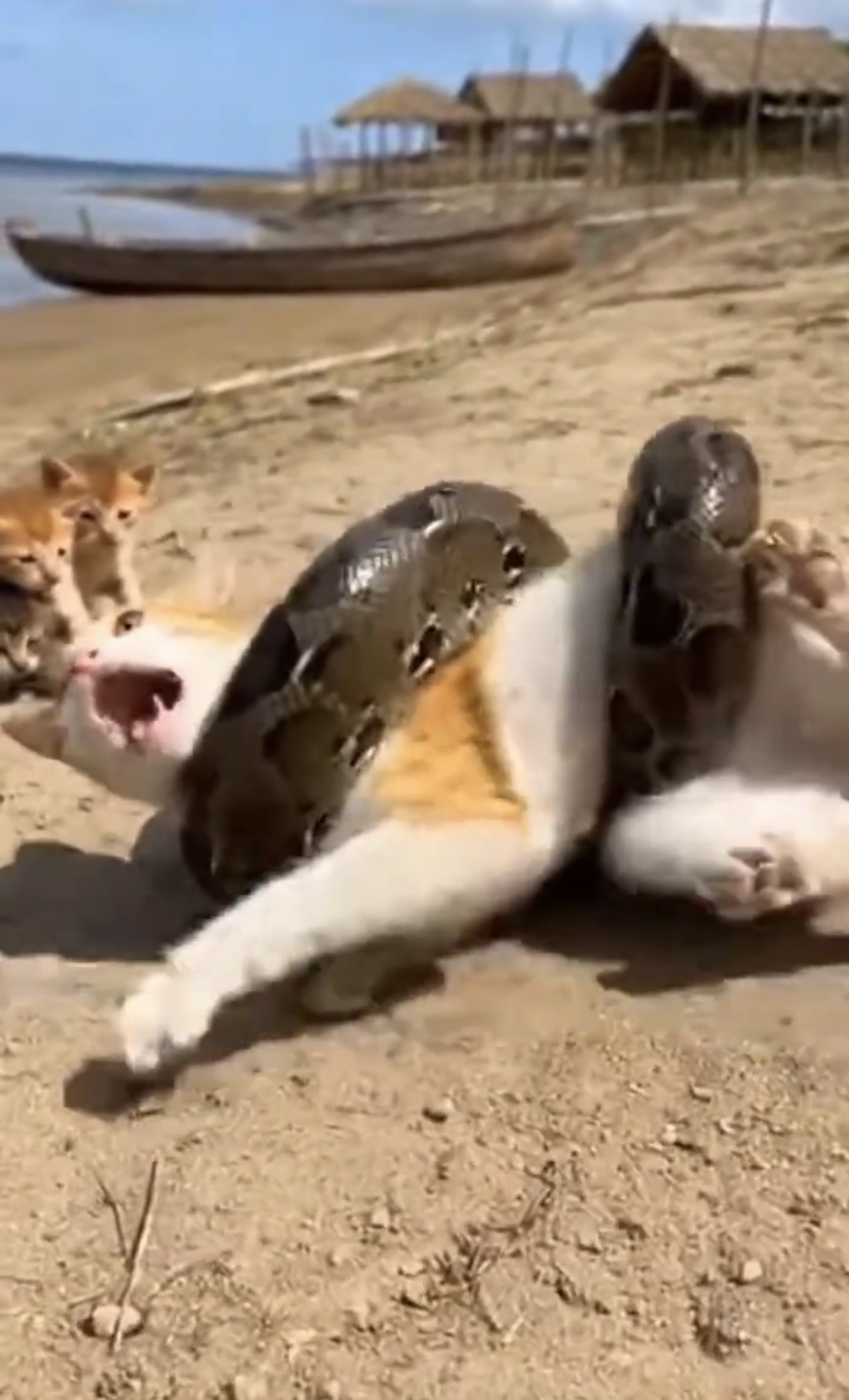A dramatic scene on a sandy riverbank shows a large python coiled around a domestic cat while two small kittens stand nearby.