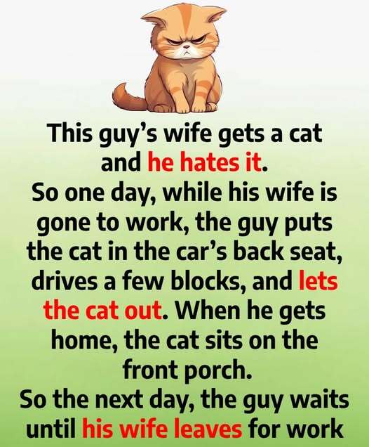 So one day, while his wife is gone to work, the guy puts the cat in the car’s back seat, drives a few blocks, and lets the cat out. When he gets home, the cat sits on the front porch.